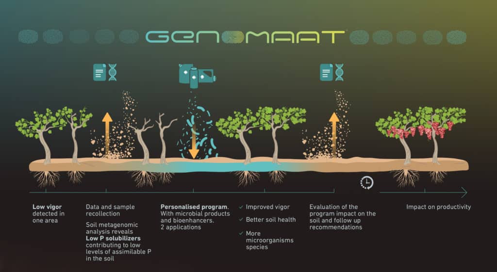 Para hacer frente al bajo vigor de la vid, el cultivador utilizó los servicios de Genomaat para analizar los datos del microbioma del suelo y desarrollar una solución microbiana a medida. En primer lugar, el proyecto definió cuatro puntos de muestreo para cada nivel de vigor de la vid (alto y bajo) más una muestra de referencia de otra zona (con un vigor óptimo). Las muestras se analizadas mediante tecnologías secuenciación de alto rendimiento.